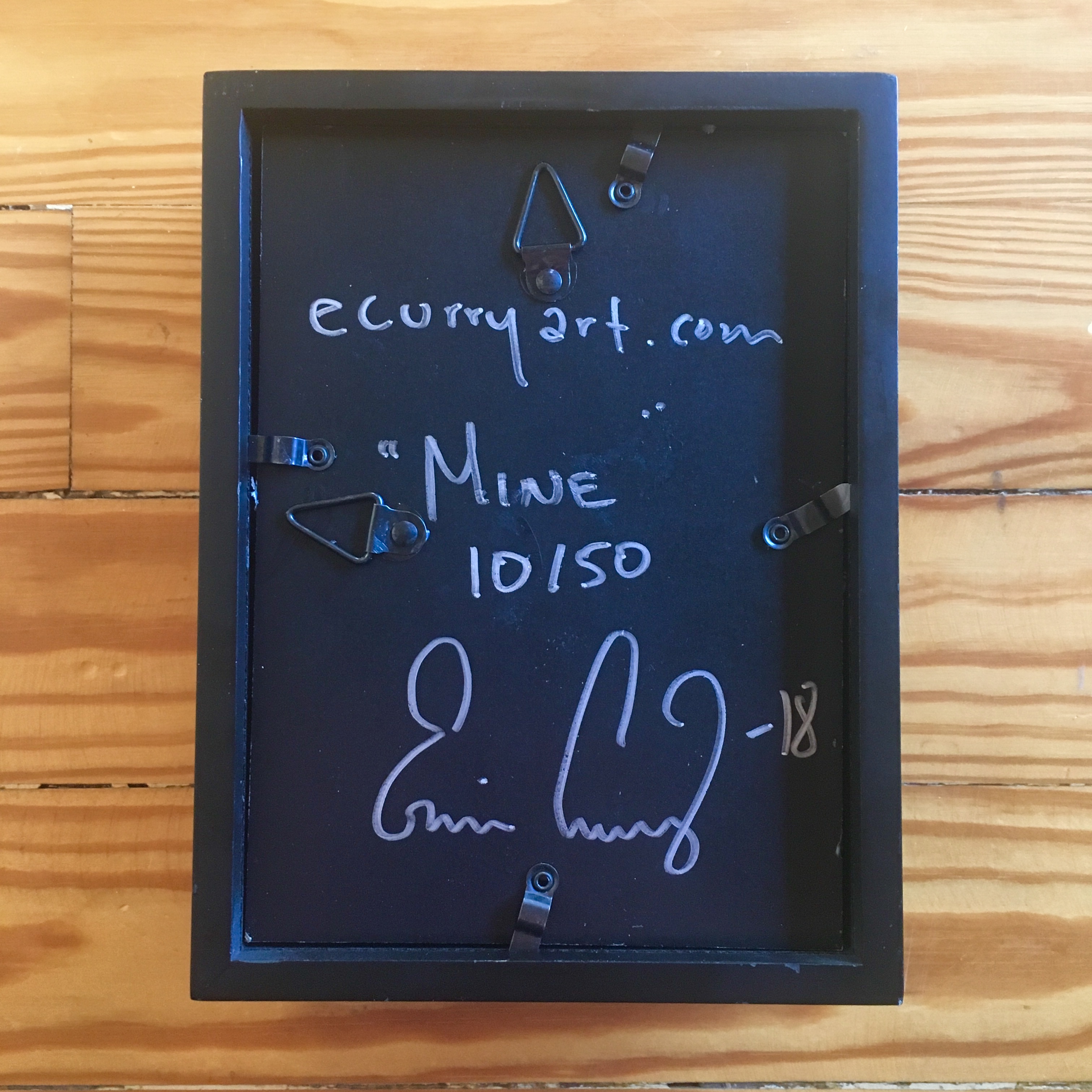 - Printed on textured Aurora White 250 gsm paper and hand cut. Elevated using needles above a one of a kind hand made background using found paper. The original hand drawn "Mine" is sold.