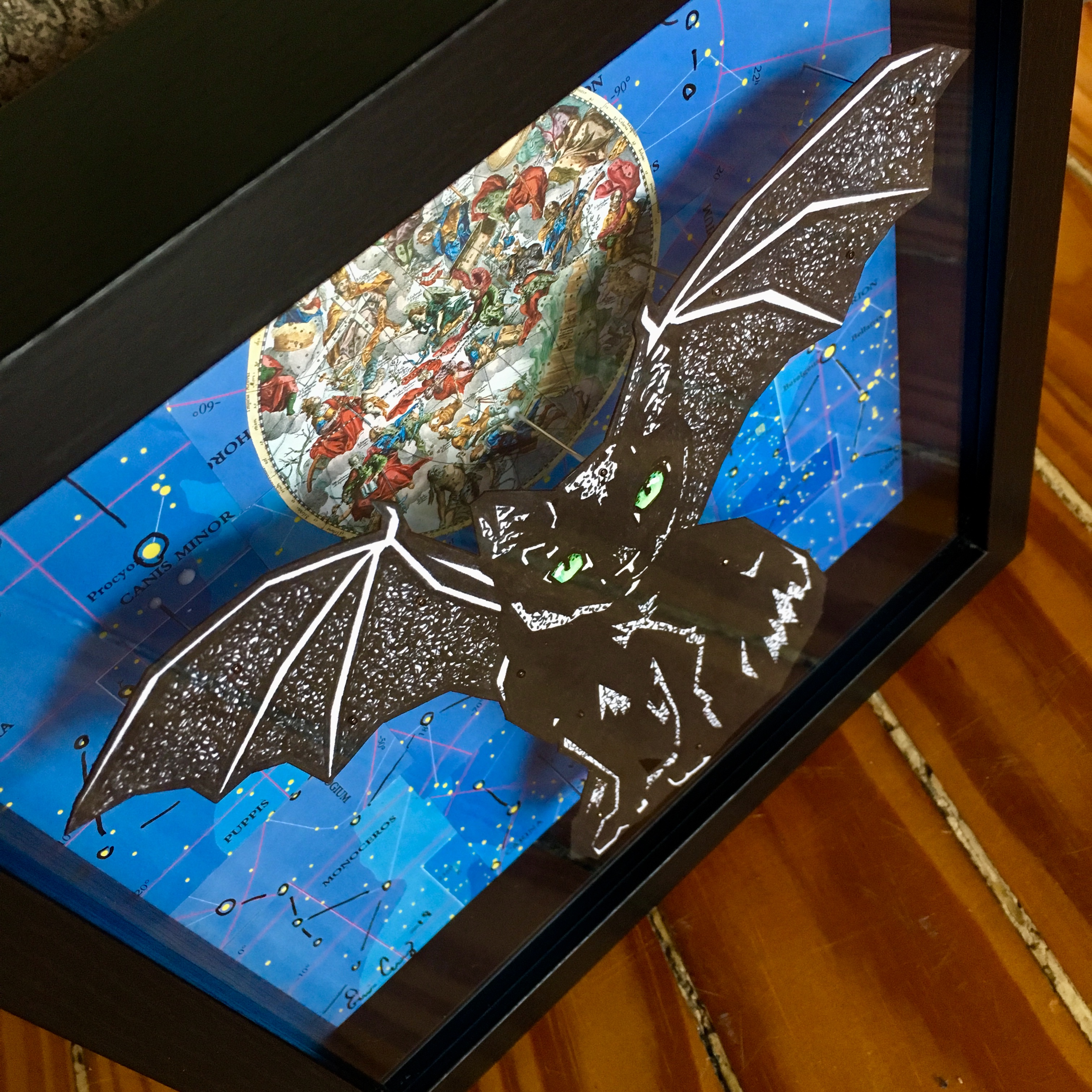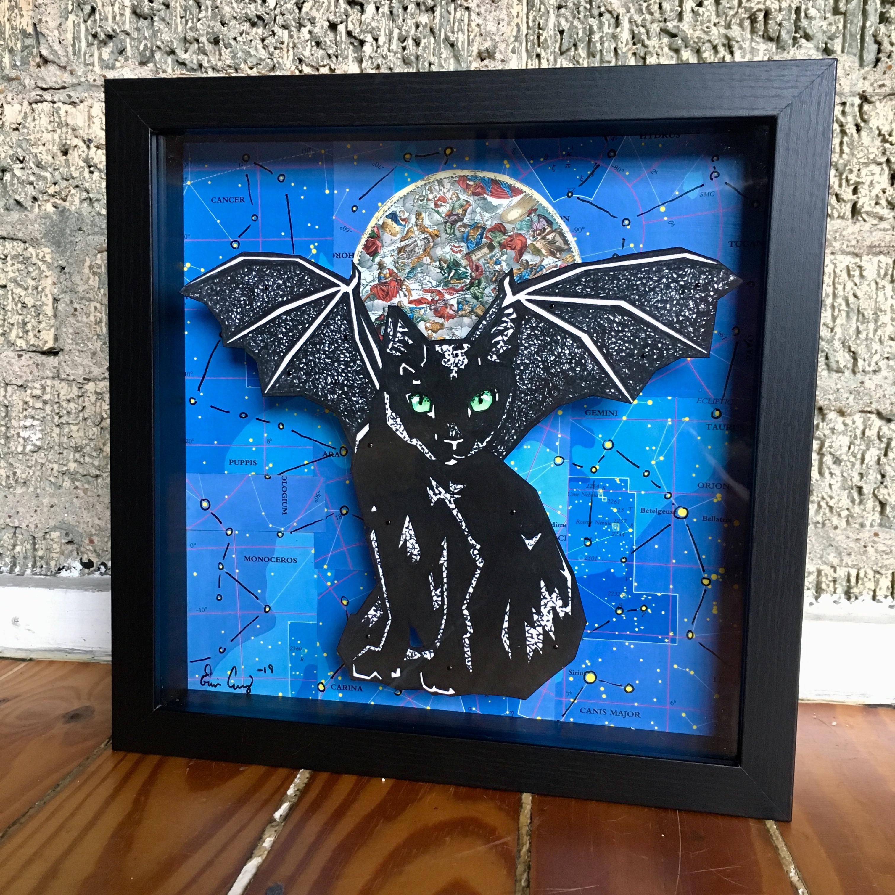 - Printed on textured Aurora White 250 gsm paper and hand cut. Elevated using needles above a one of a kind hand made background using star maps and found paper. The original hand drawn "BatCat" is sold.