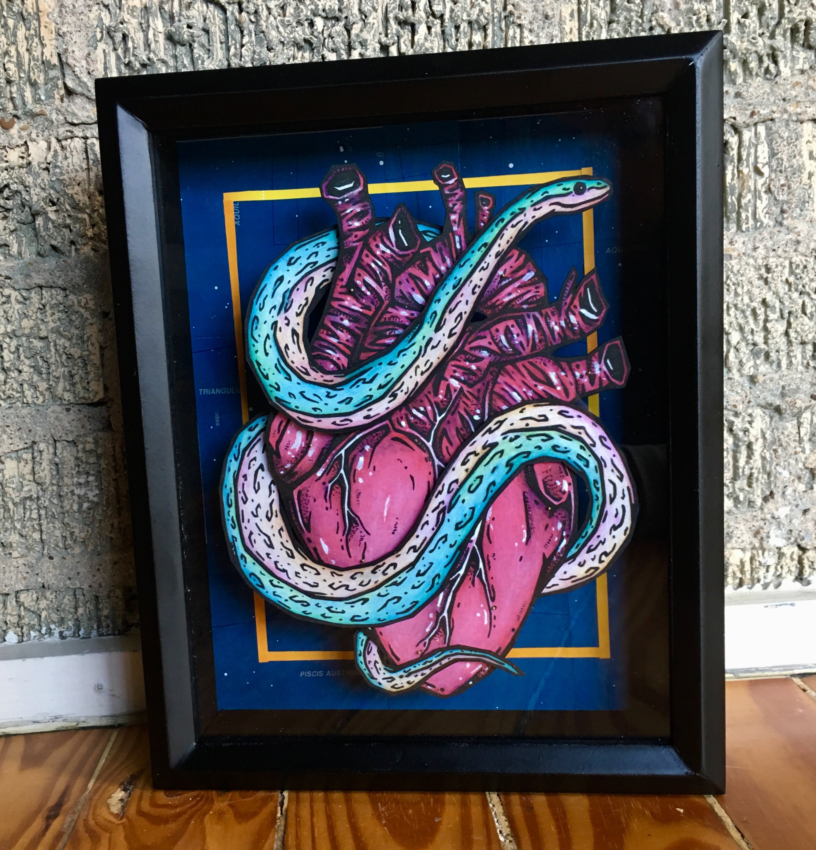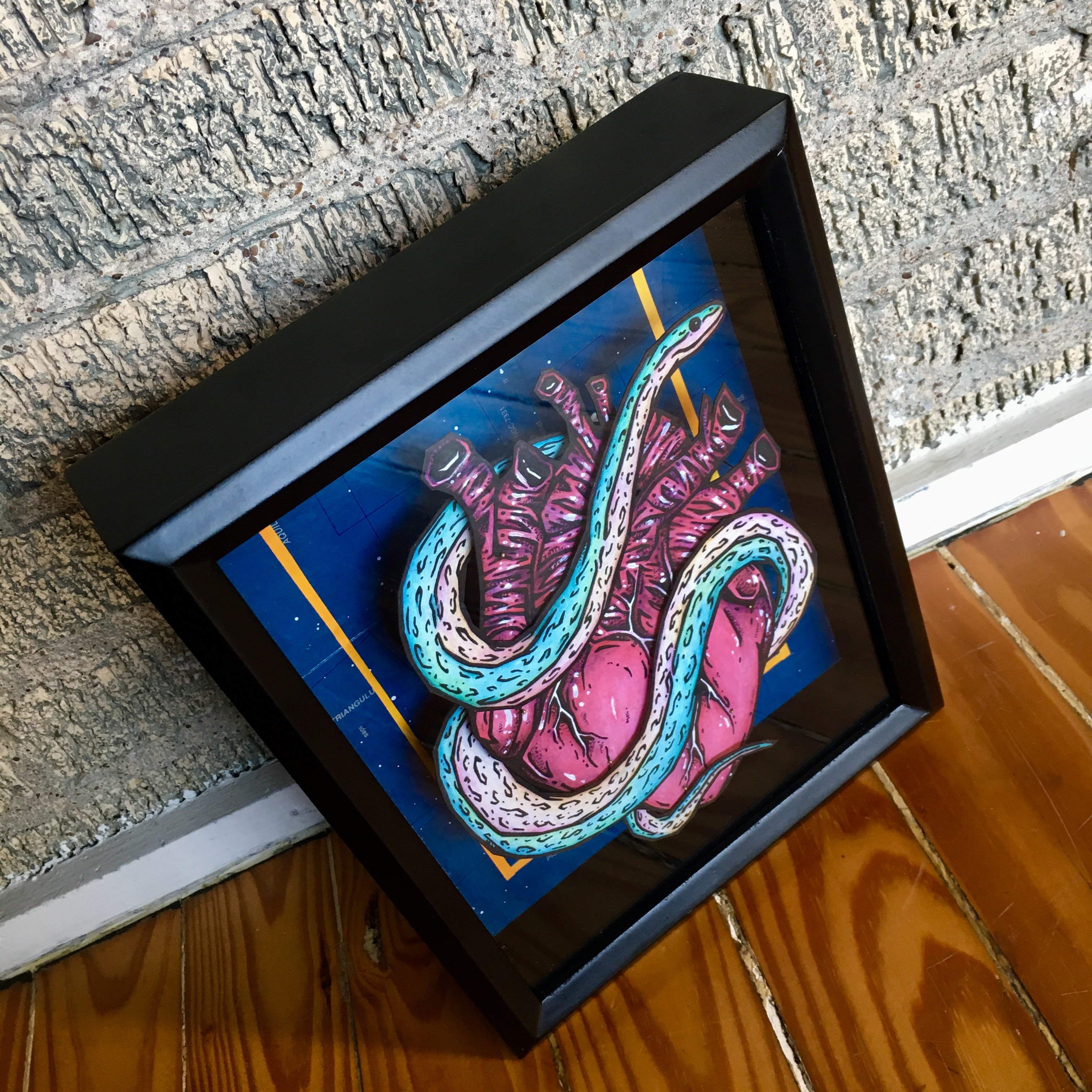 - Printed on textured Aurora White 250 gsm paper and hand cut. Elevated using needles above a one of a kind hand made background using found star maps. Shadowbox is 8"x10" with glass. The original hand drawn "Embrace" is sold.