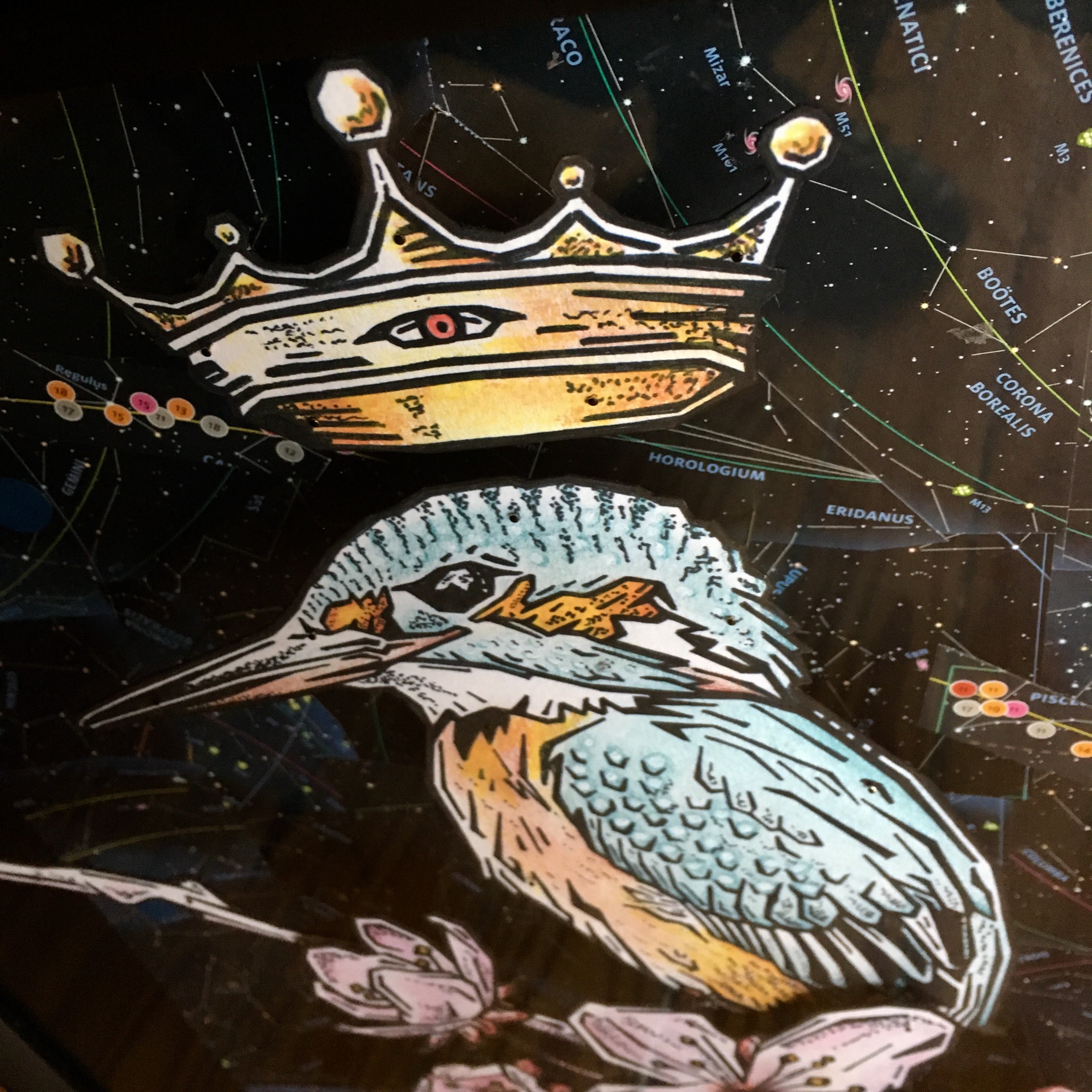 - Printed on textured Aurora White 250 gsm paper and hand cut. Elevated using needles above a one of a kind hand made background using found star maps. Shadowbox is 12"x16" with glass. The original hand drawn "The Night King" is sold.
