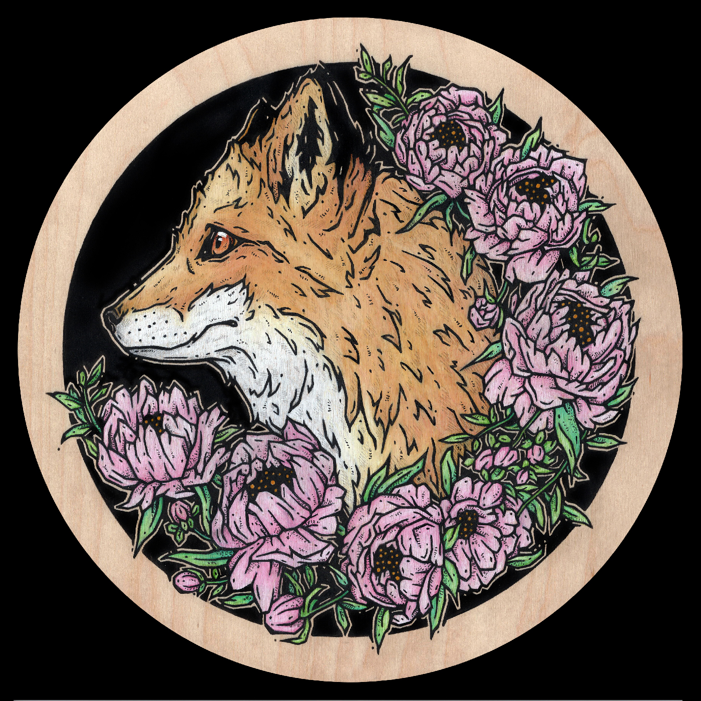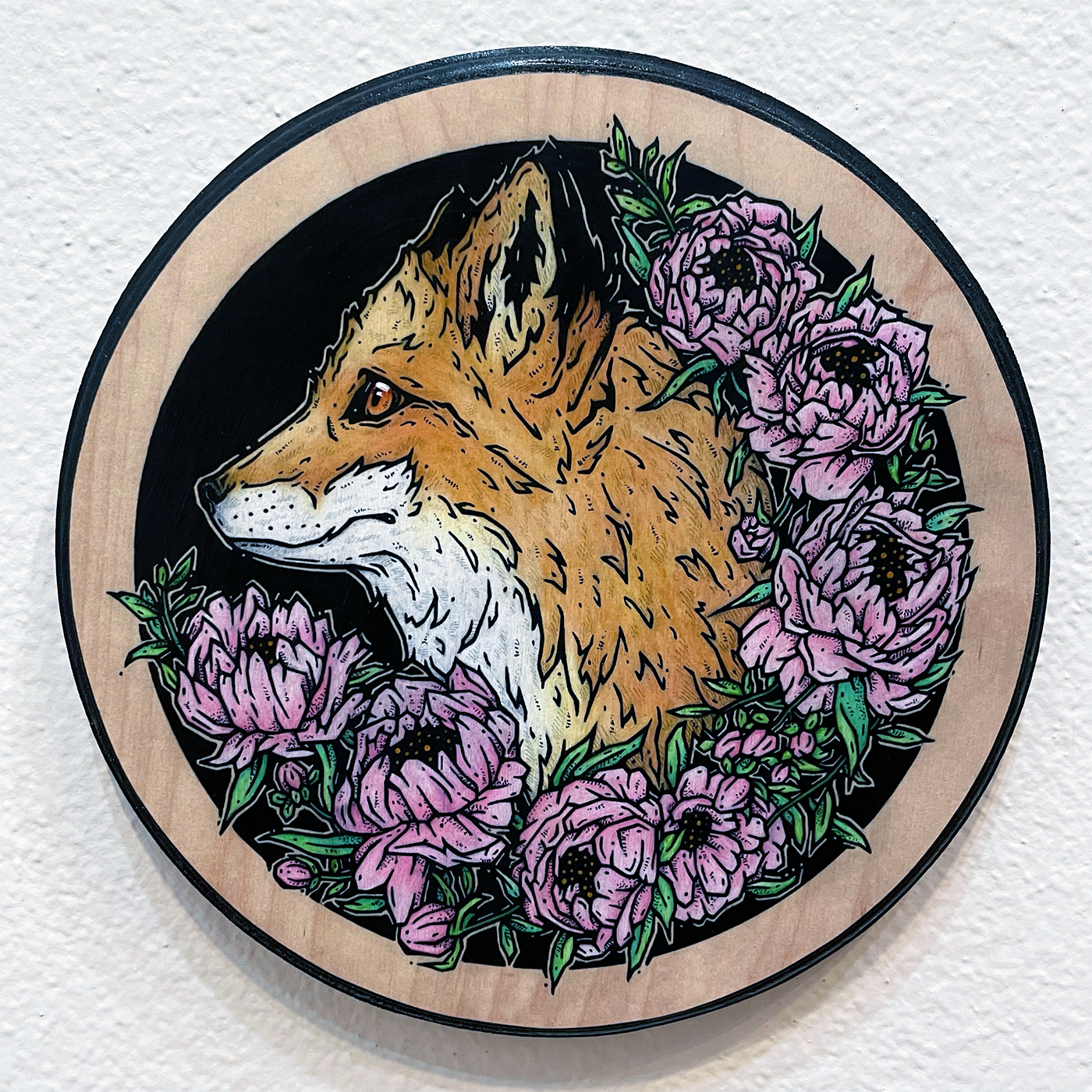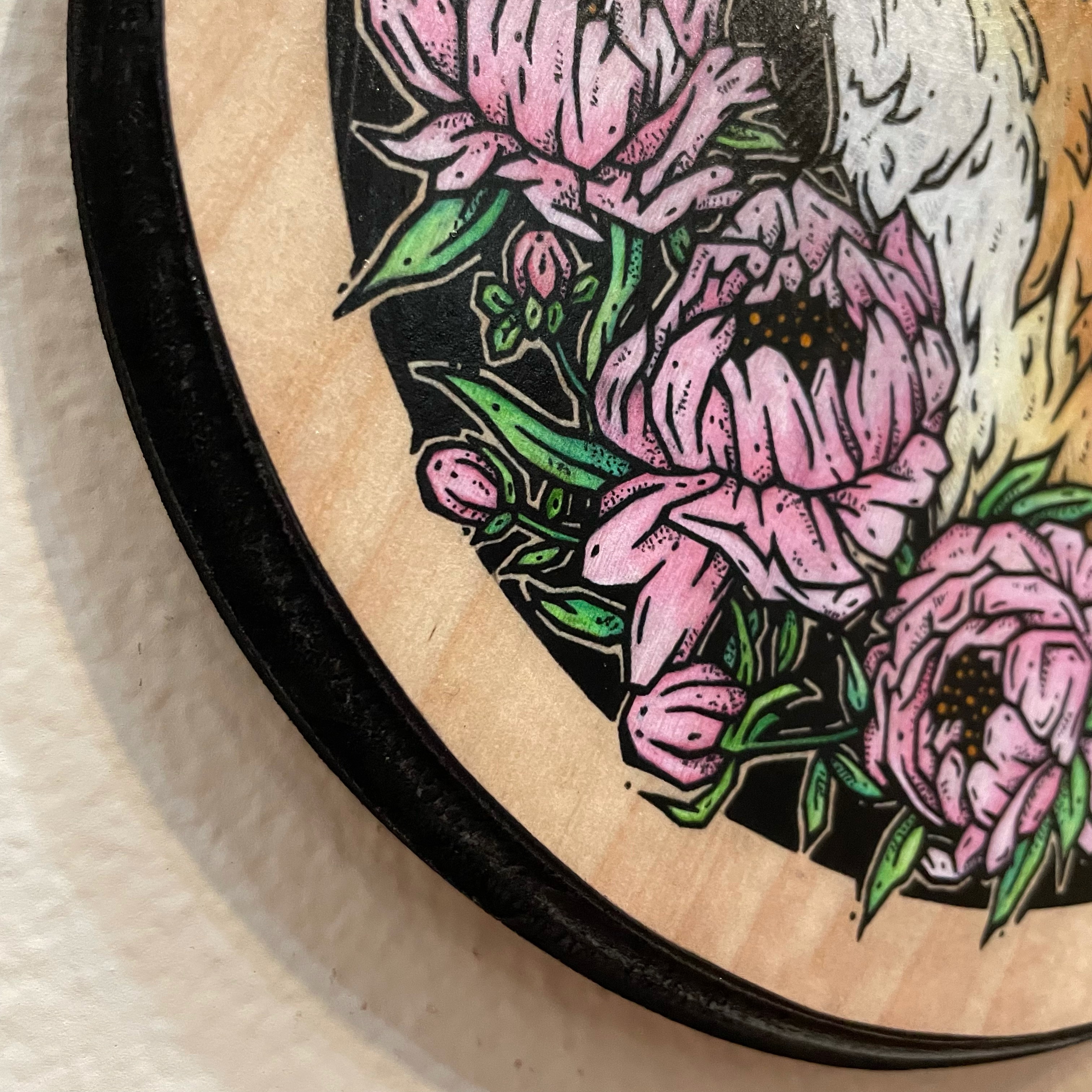 - Printed on 250 gsm Aurora White paper and mounted onto 8" circular black wood panel. Finished with Liquitex varnish. Hanger on back.