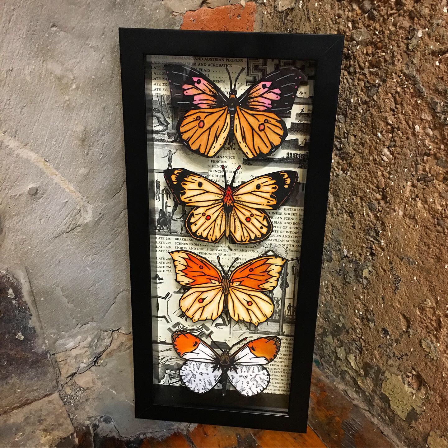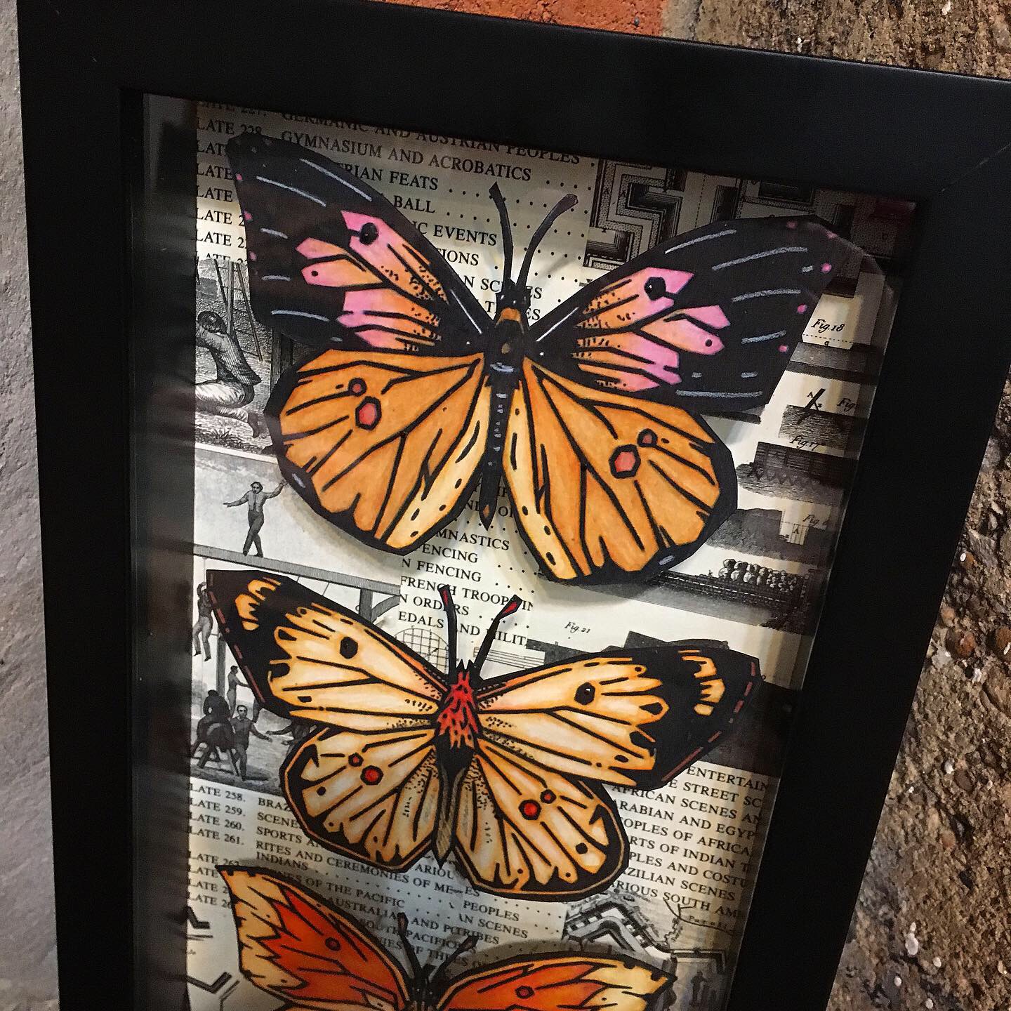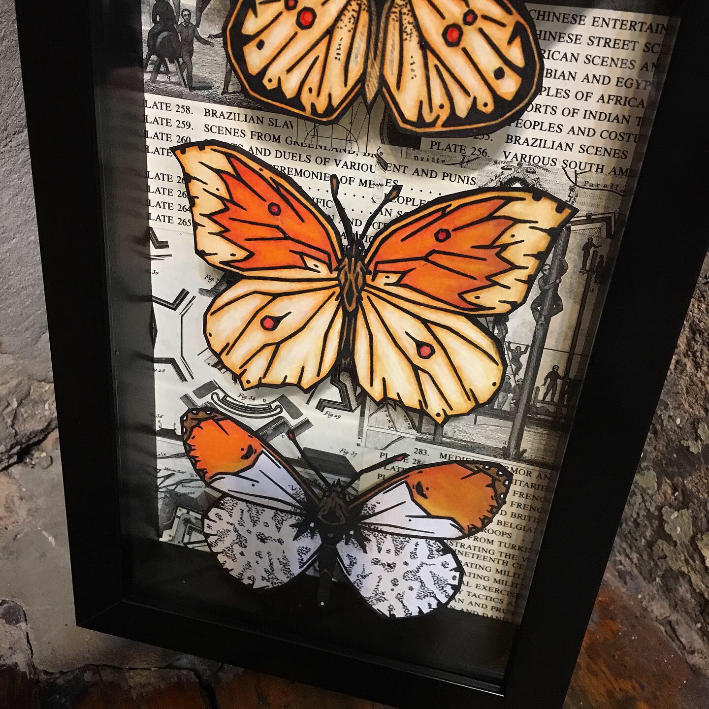 - Printed on textured Aurora White 250 gsm paper and hand cut. Each butterfly is elevated using needles above a one of a kind hand made background using collage from the Encyclopedia of Illustration. Each butterfly is hand embellished.
