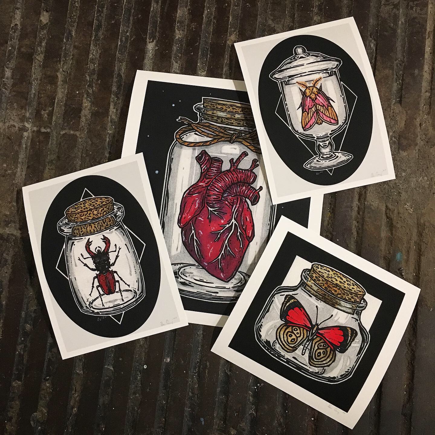 - This print set includes 4 prints of my apothecary series. One each of 5"x7" beetle and moth prints, a 6"x6" butterfly and an 8"x10" heart print. All of these prints are hand signed and fit into any standard sized frame.