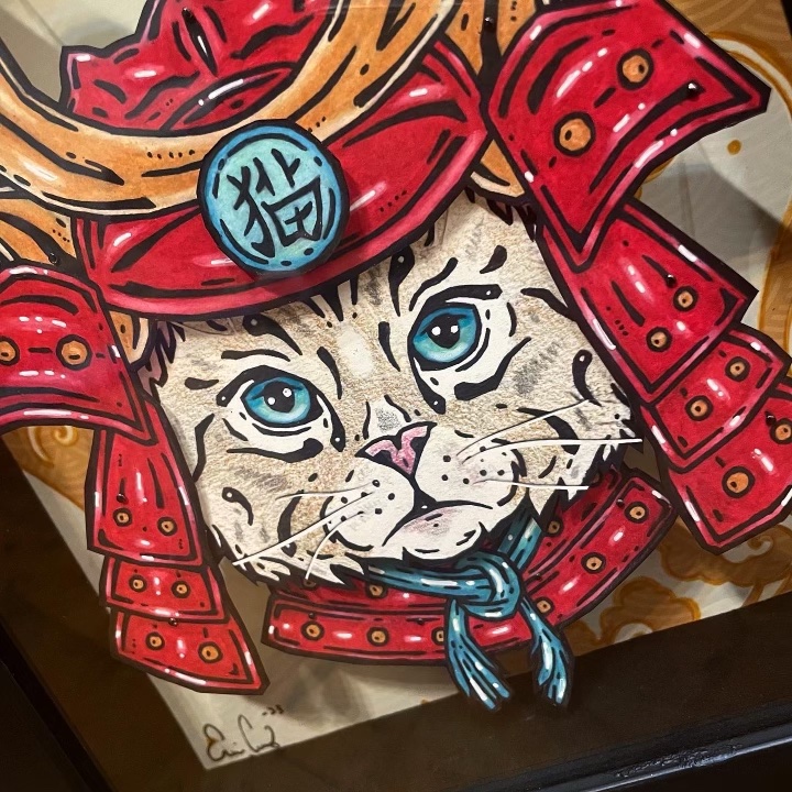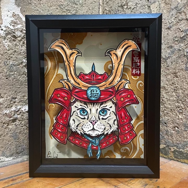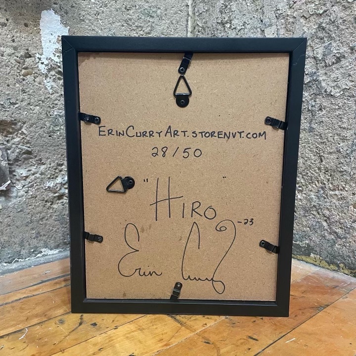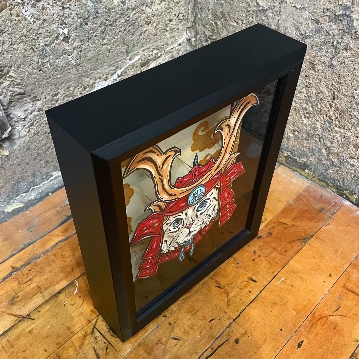 - Printed on textured Aurora White 250 gsm paper and hand cut. Elevated using needles above a one of a kind hand made background using found oragami paper. Shadowbox is 8"x10" with glass. The original hand drawn "Hiro" is sold.
