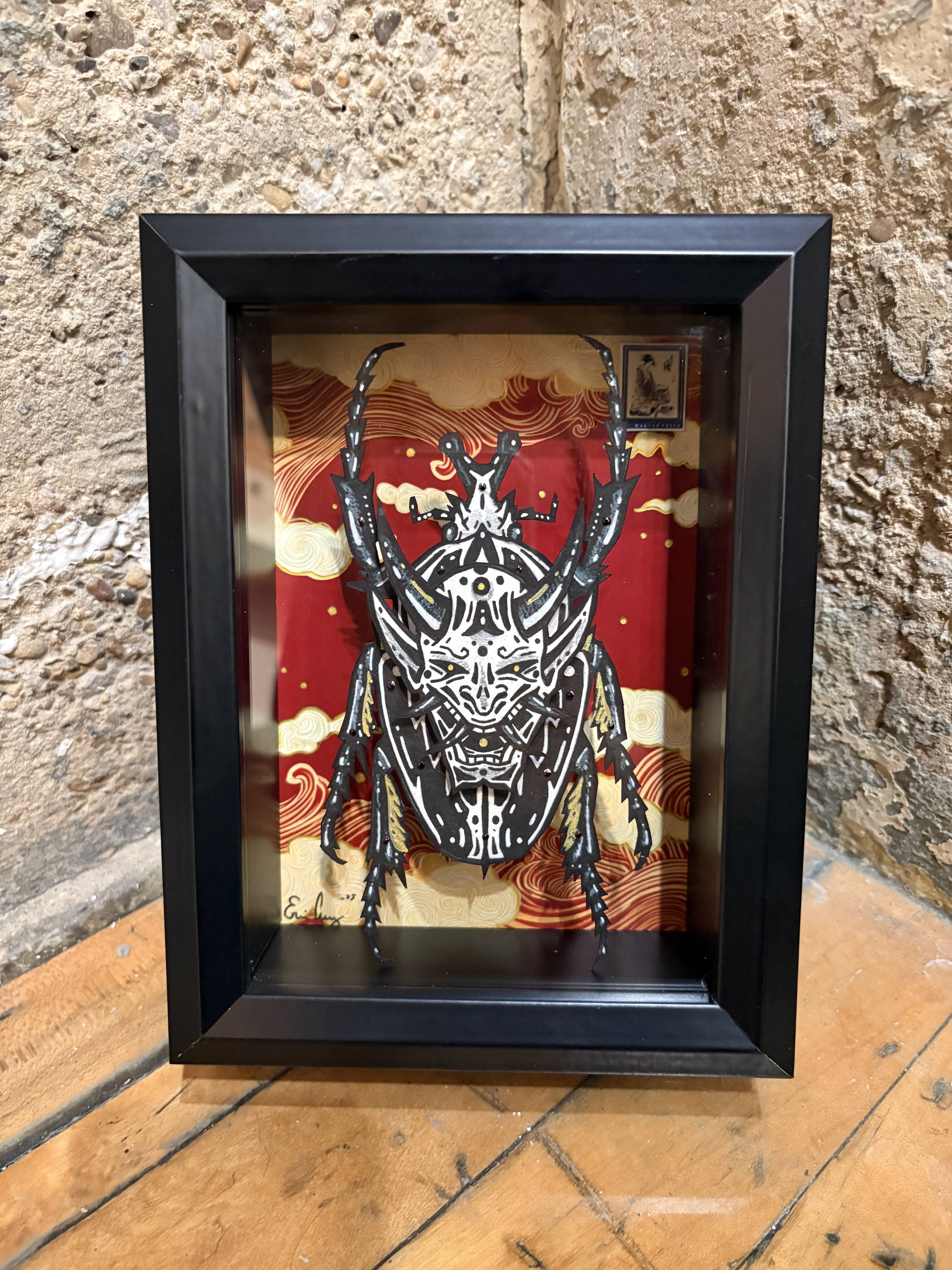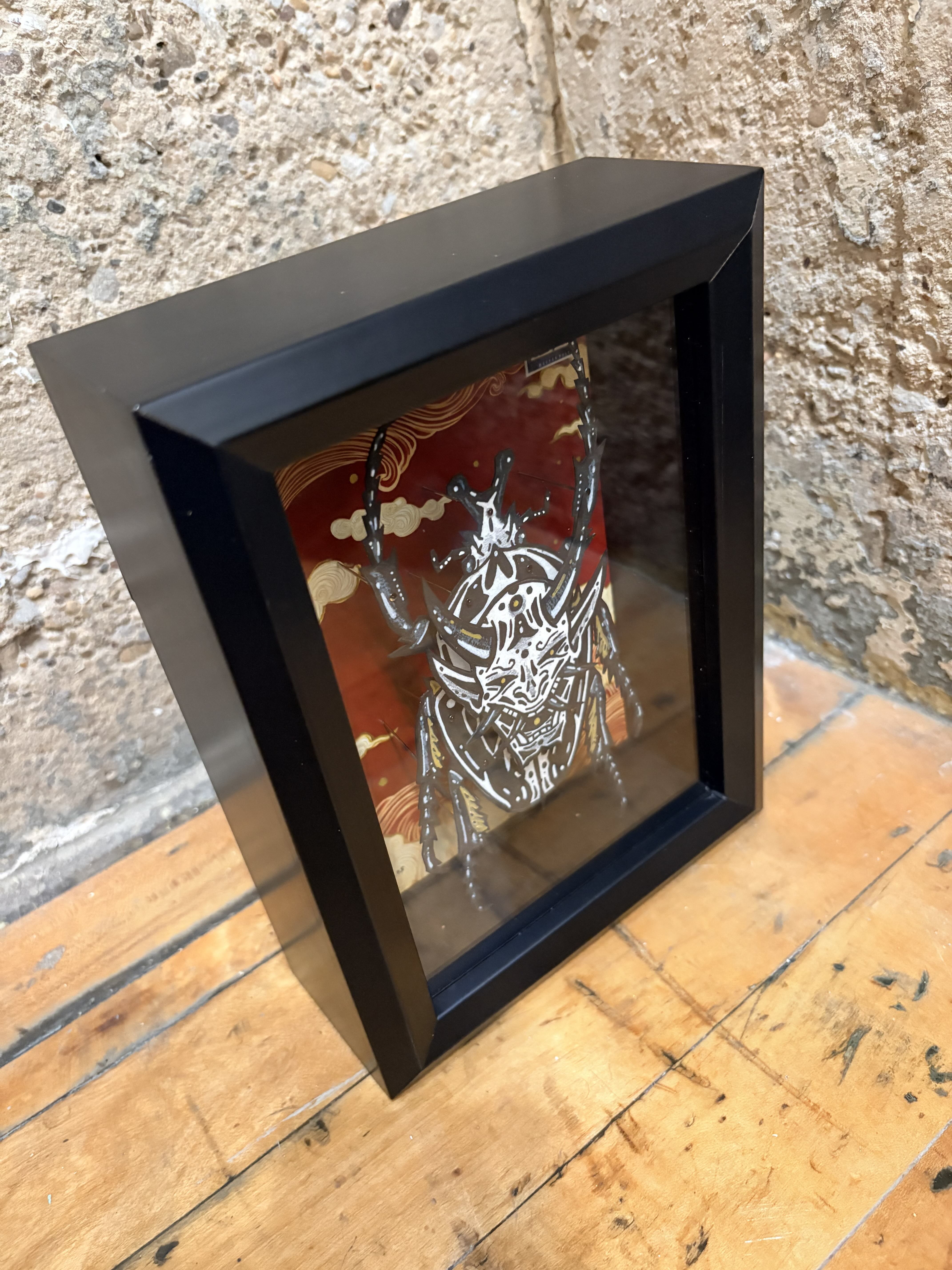 - Printed on textured Aurora White 250 gsm paper and hand cut. Elevated using needles above a one of a kind hand made background using found oragami paper. Shadowbox is 5"x7" with glass.