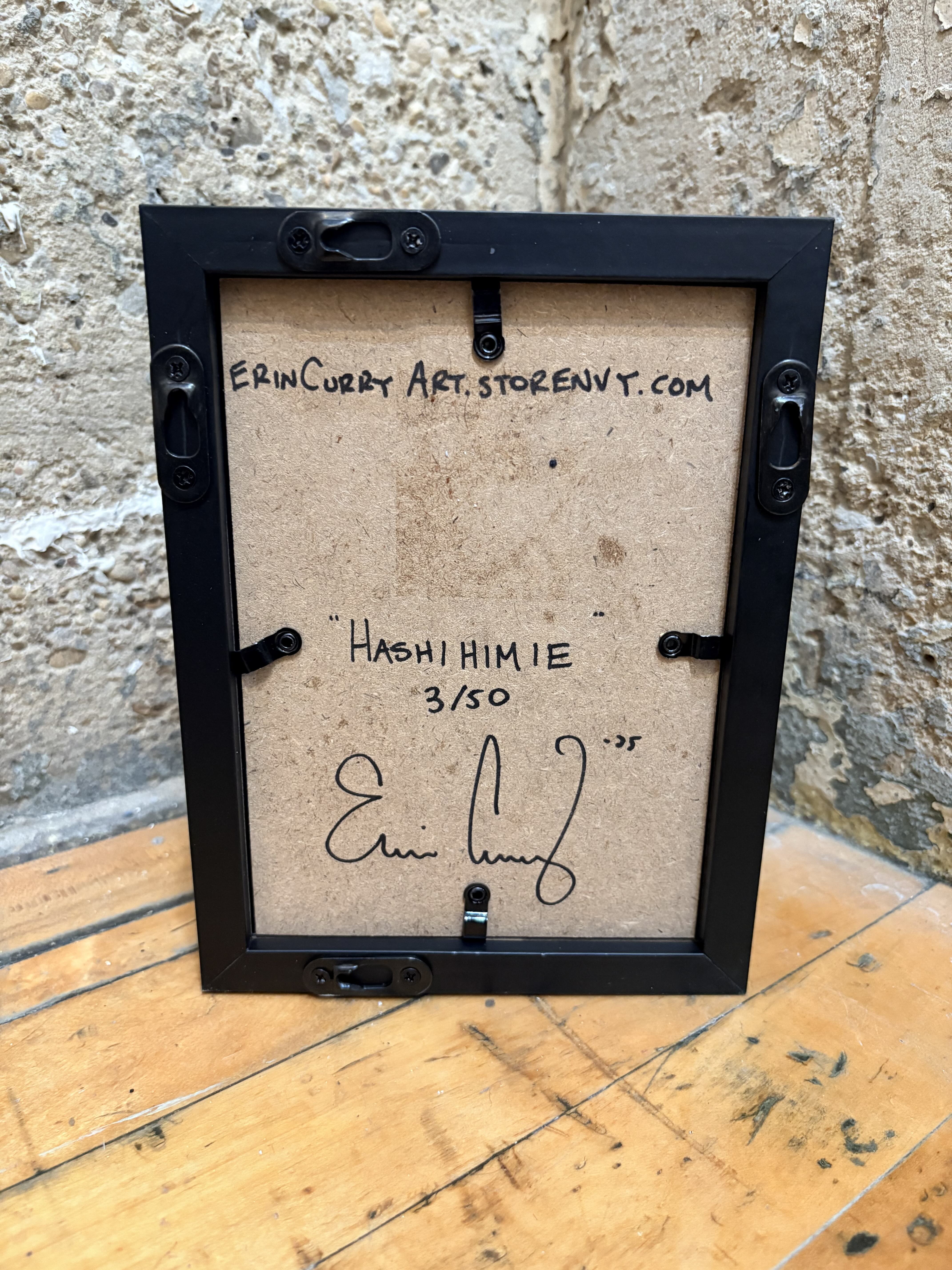 - Printed on textured Aurora White 250 gsm paper and hand cut. Elevated using needles above a one of a kind hand made background using found oragami paper. Shadowbox is 5"x7" with glass.