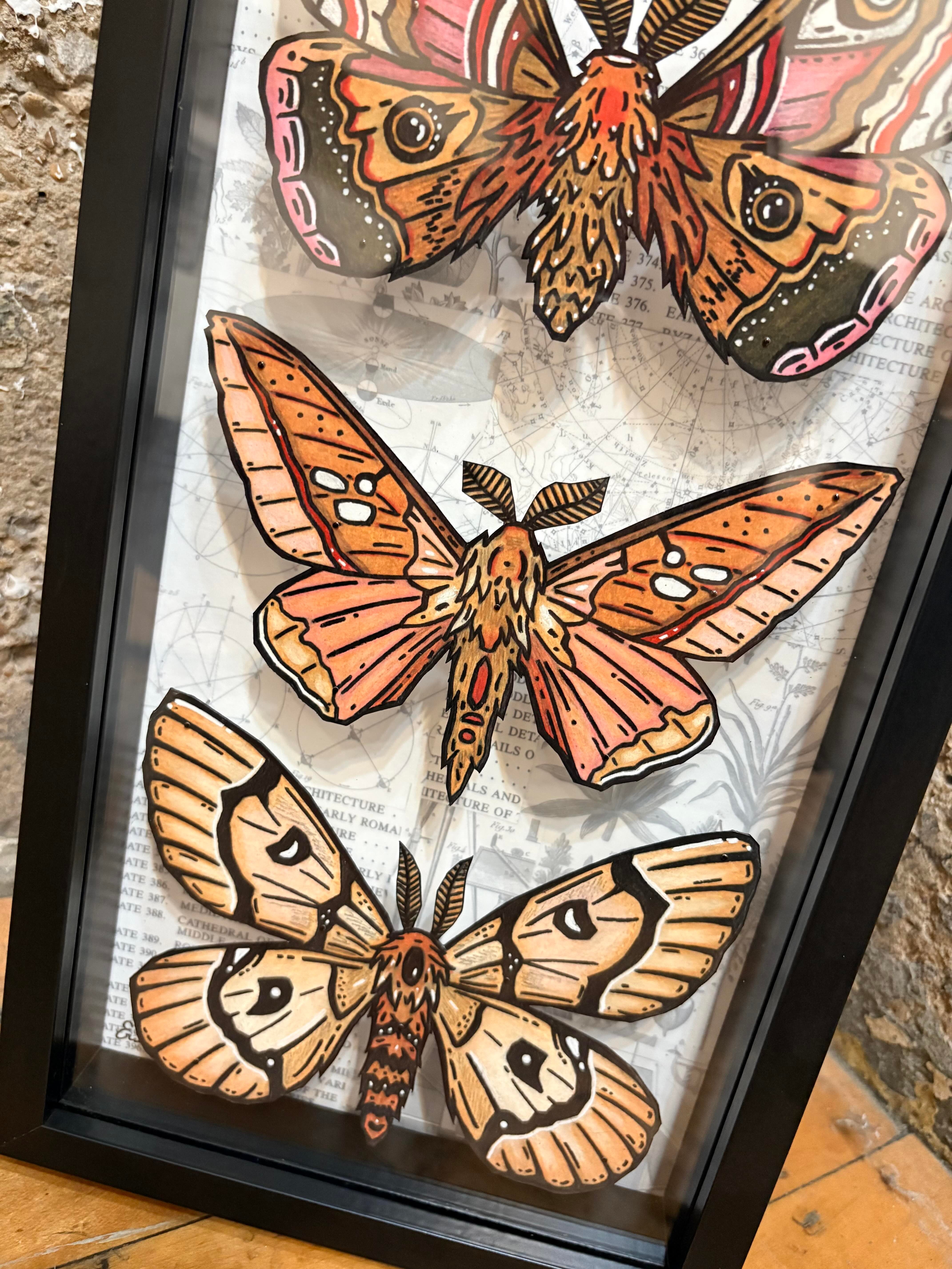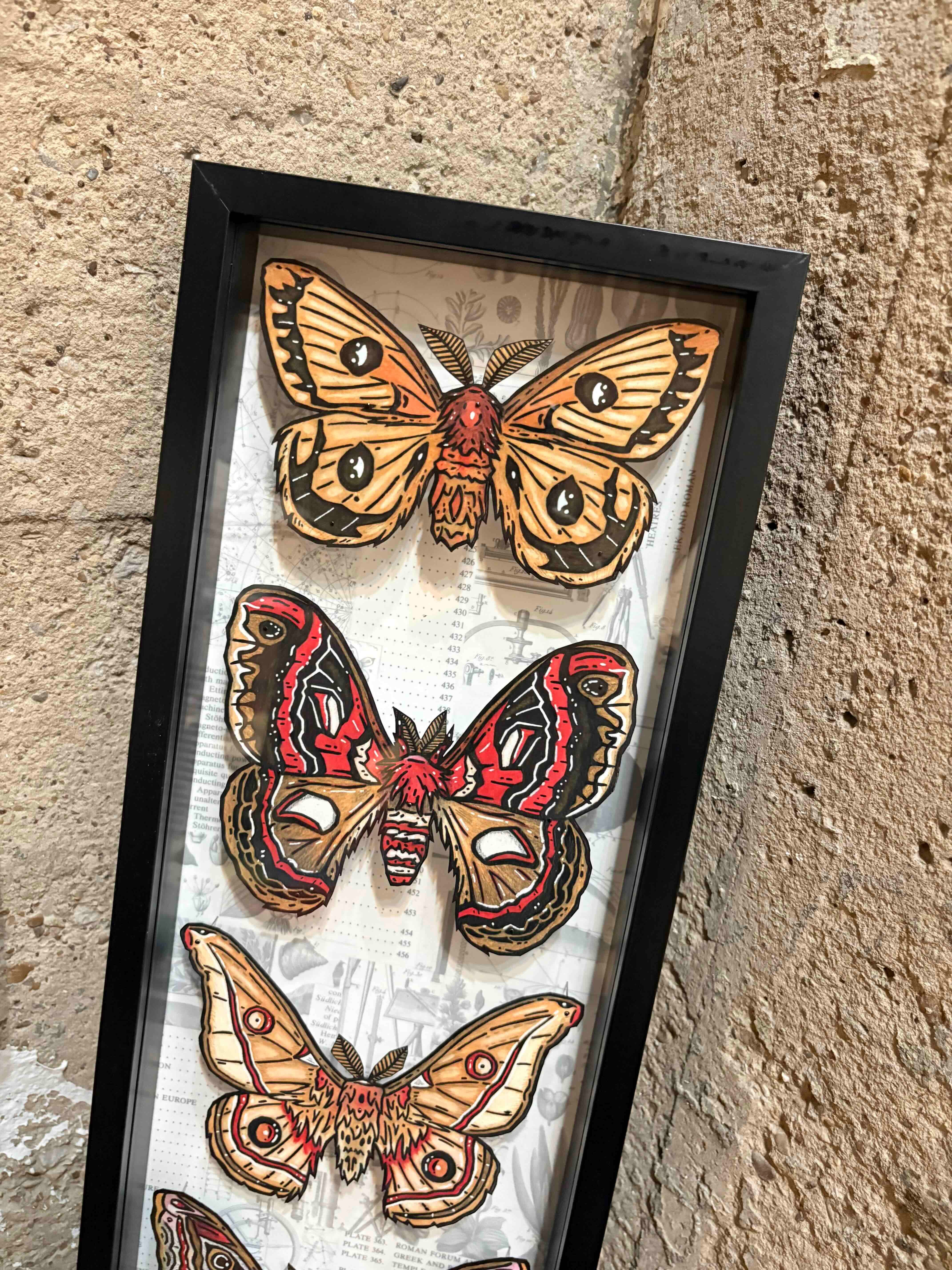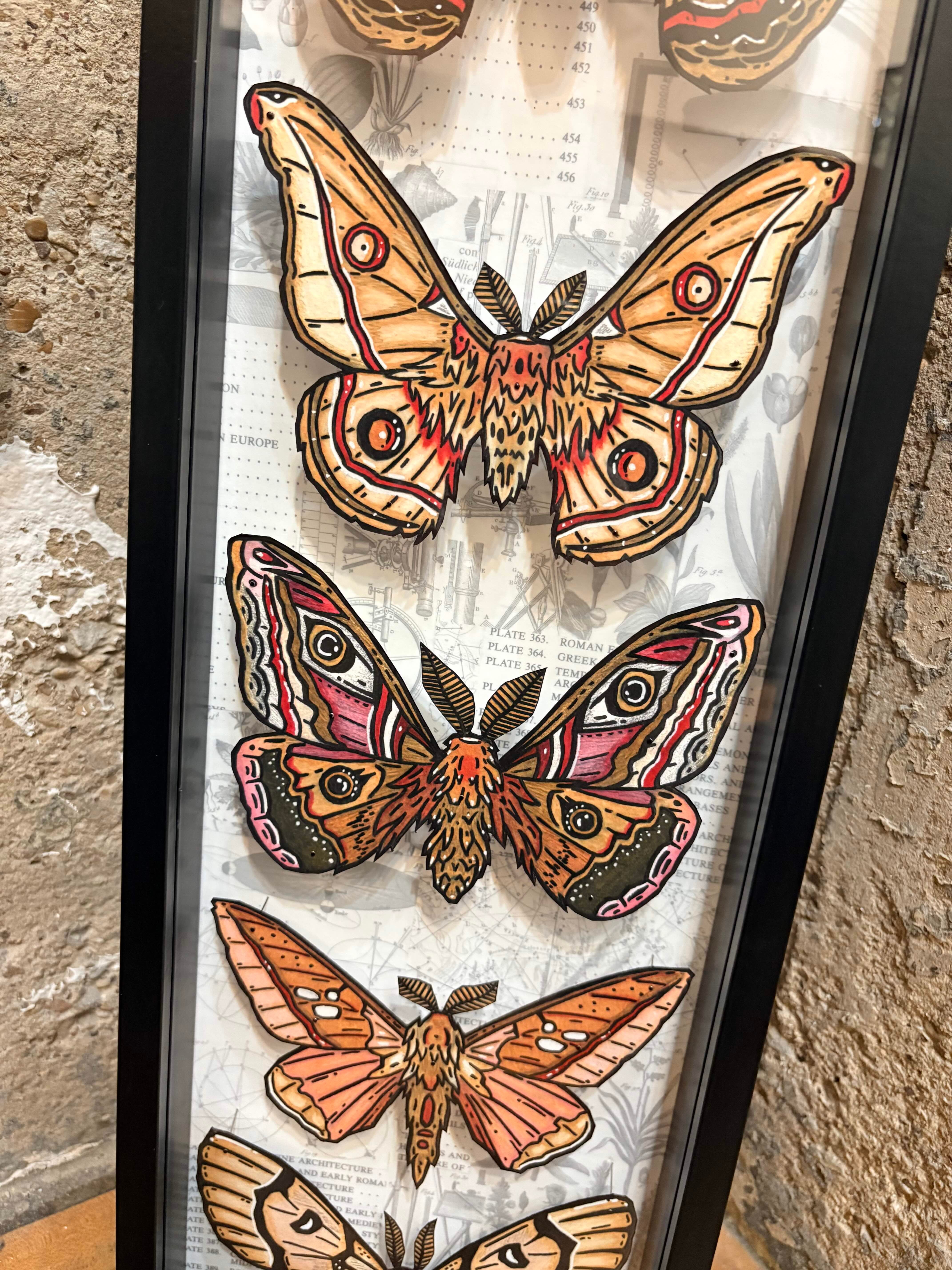 - 6 moths printed on textured Aurora White 250 gsm paper and hand cut. Elevated using needles above a one of a kind hand made background using found encyclopedia paper. Shadowbox is 8"x10" with glass.